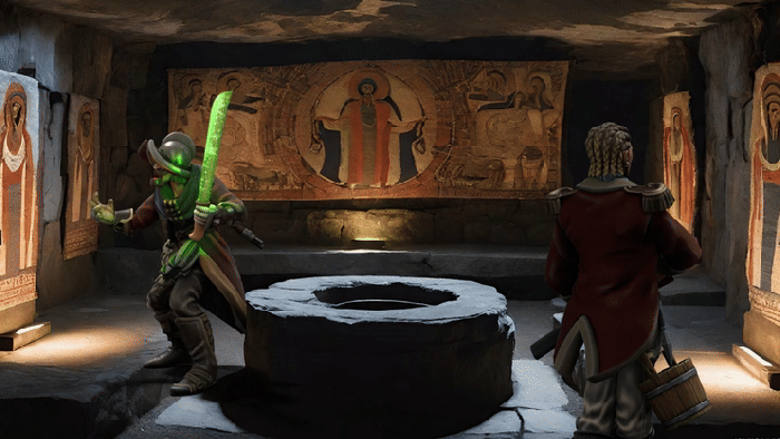 Agreeing to assist with the puzzle we begin moving the stone tiles into the central raised area. Light shines from above onto a blood-stained altar in the centre of the room, a narrow hole in the altar presents a draft.